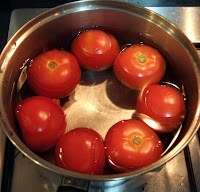 1. score a cross on the bottom of tomatoes, dunk them in boiling water for 30-50 seconds, the skin would slipt